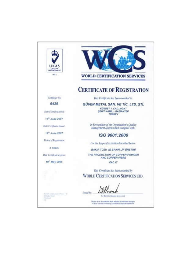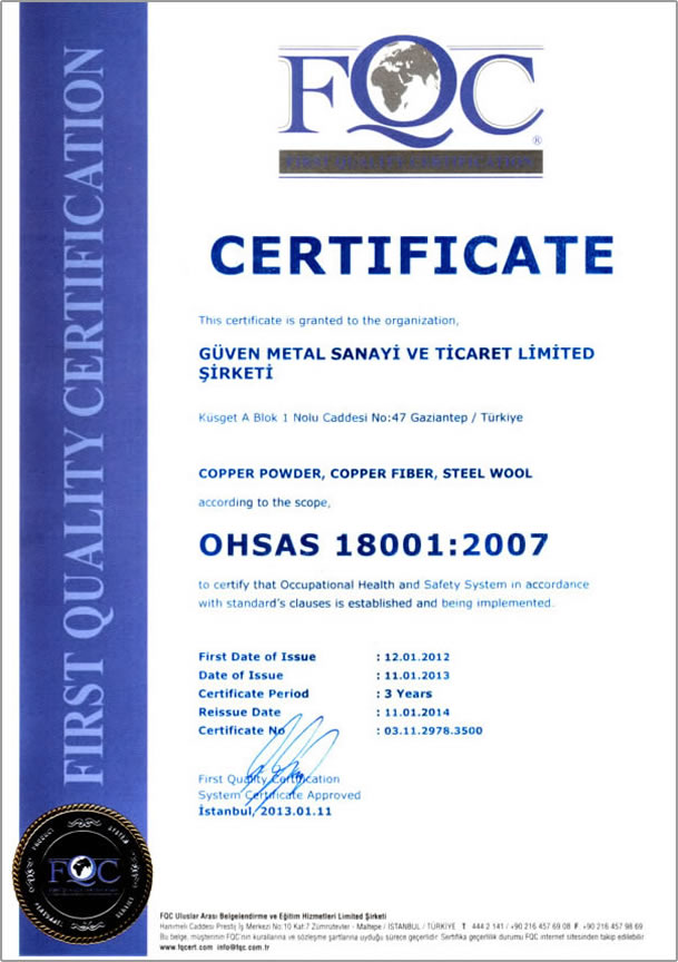 Güven Metal olarak metal tozu ve çelik yünü üretimimizle sektörde sürdürülebilir ilişkiler kurma vizyonumuzu destekleyen bir kalite politikasını benimsemiş durumdayız. Kalite Yönetim Sistemimiz; yasal mevzuatlar, müşteri özel istekleri ve teknik gereklilikleri de içeren tüm şartları yerine getirmeyi amaçlıyor.